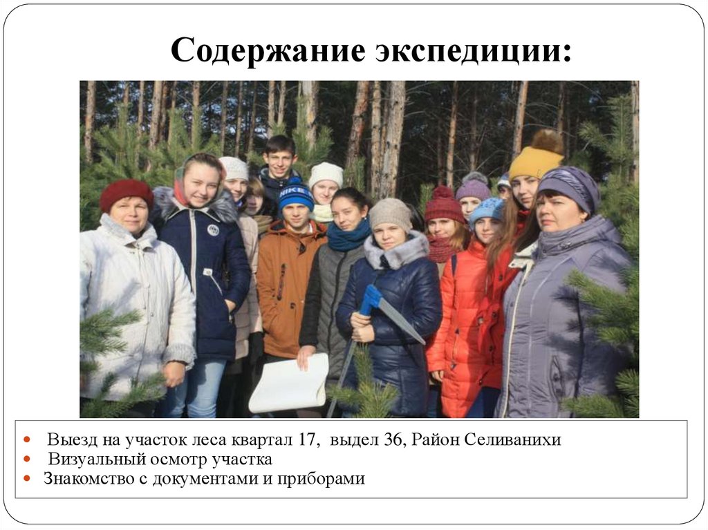 Содержание экспедиции:Выезд на участок леса квартал 17, выдел 36, Район Селиванихи