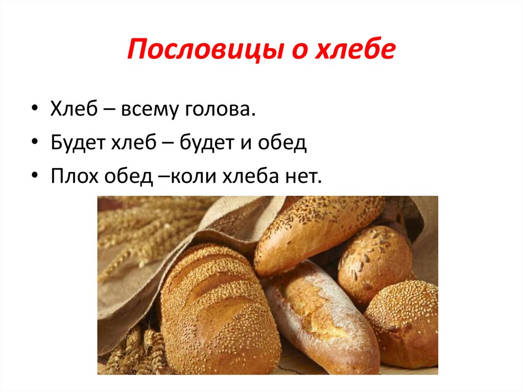 Пословицы о хлебе• Хлеб – всему голова.