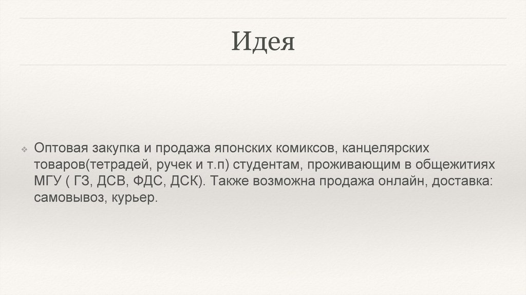 Продажа канцелярских товаров и японских комиксов в общежитиях МГУ им. М. В. Ломоносова. Команда 11