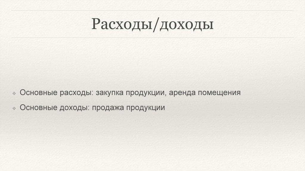 Основные расходы: закупка продукции, аренда помещения