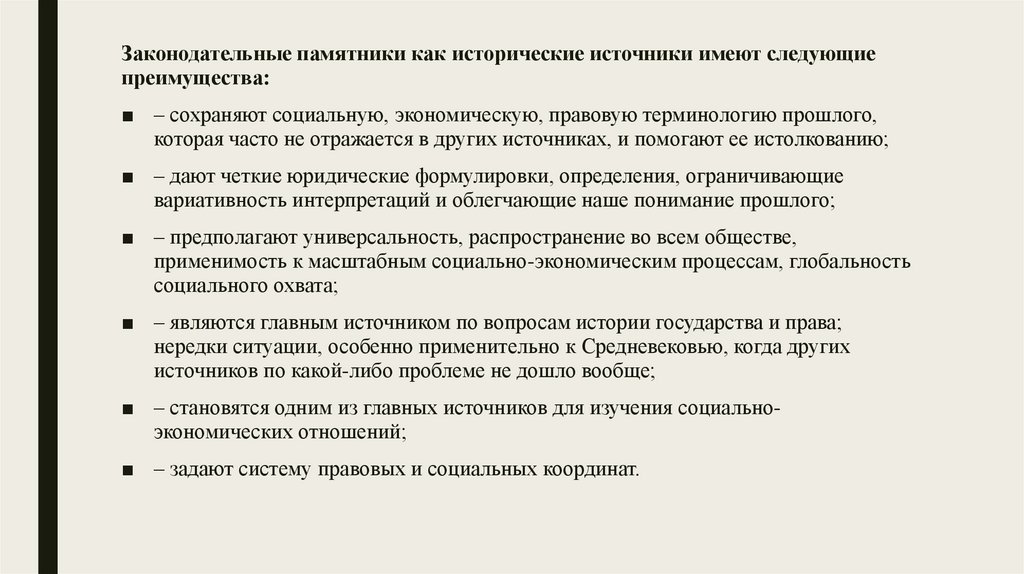 Законодательные памятники как исторические источники имеют следующиепреимущества: