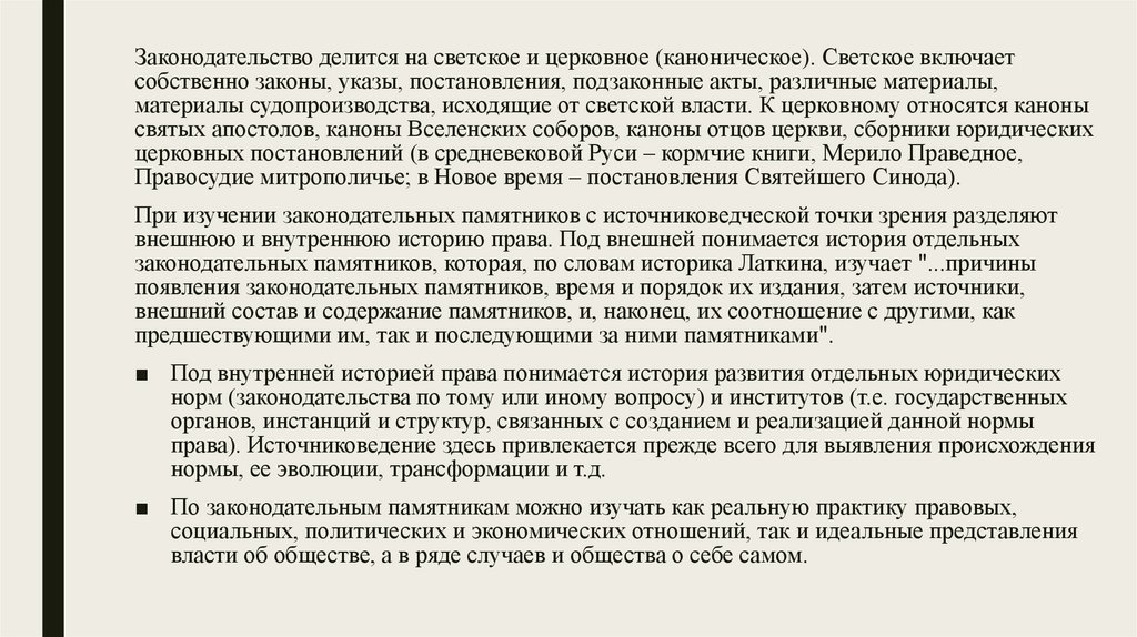 законодательных памятников, которая, по словам историка Латкина, изучает "...причины