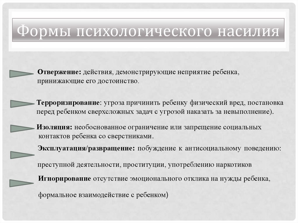 Формы психологического насилияОтвержение: действия, демонстрирующие неприятие ребенка,