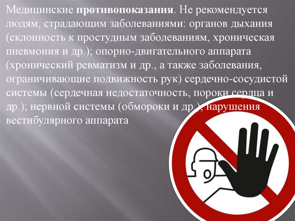 Медицинские противопоказания. Не рекомендуетсялюдям, страдающим заболеваниями: органов дыхания