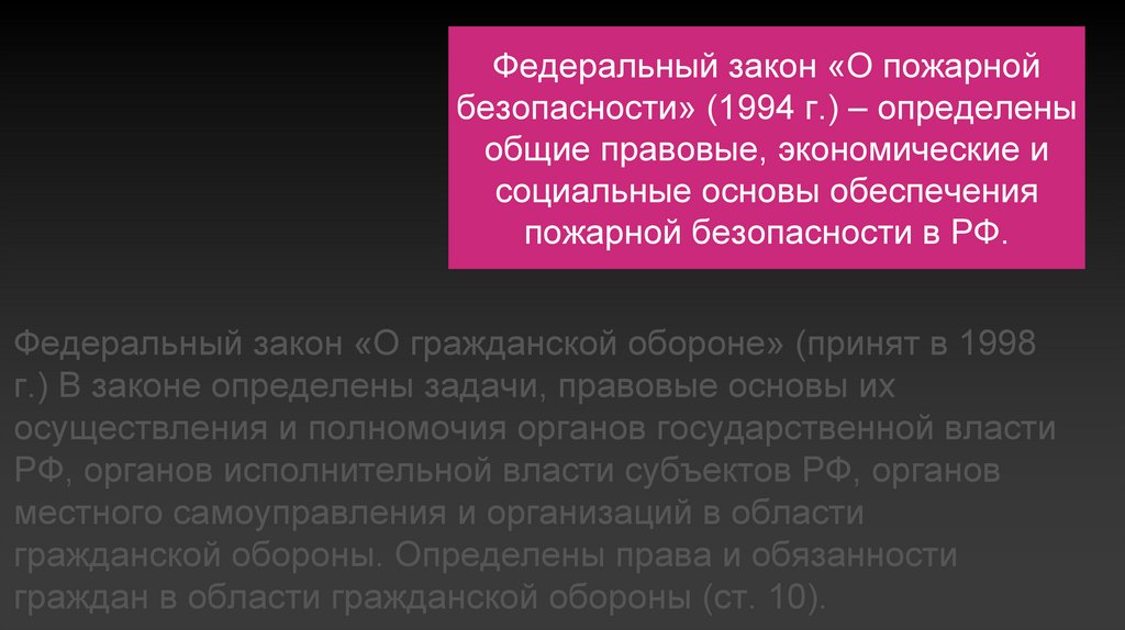 Федеральный закон «О пожарнойбезопасности» (1994 г.) – определены
