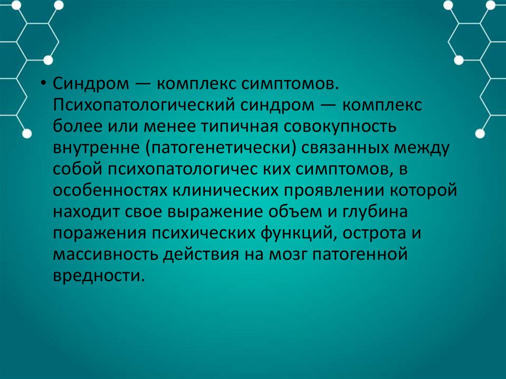 • Синдром — комплекс симптомов.Психопатологический синдром — комплекс
