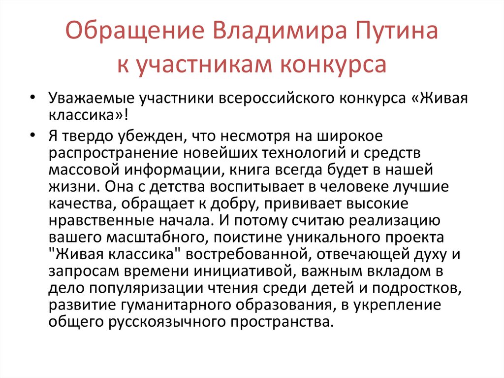 Обращение Владимира Путинак участникам конкурса