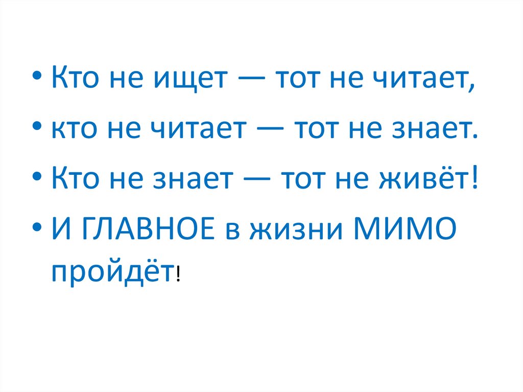 • Кто не ищет — тот не читает,• кто не читает — тот не знает.