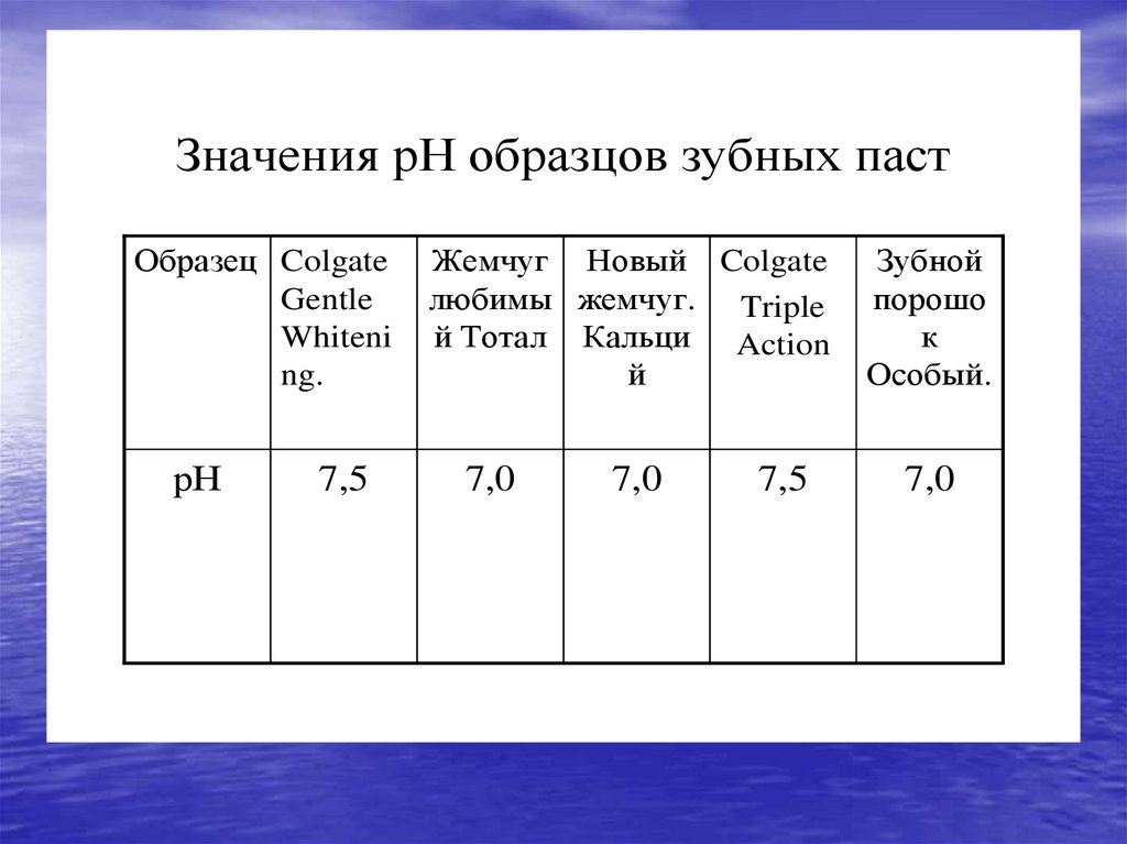 Значения рН образцов зубных пастОбразец Colgate