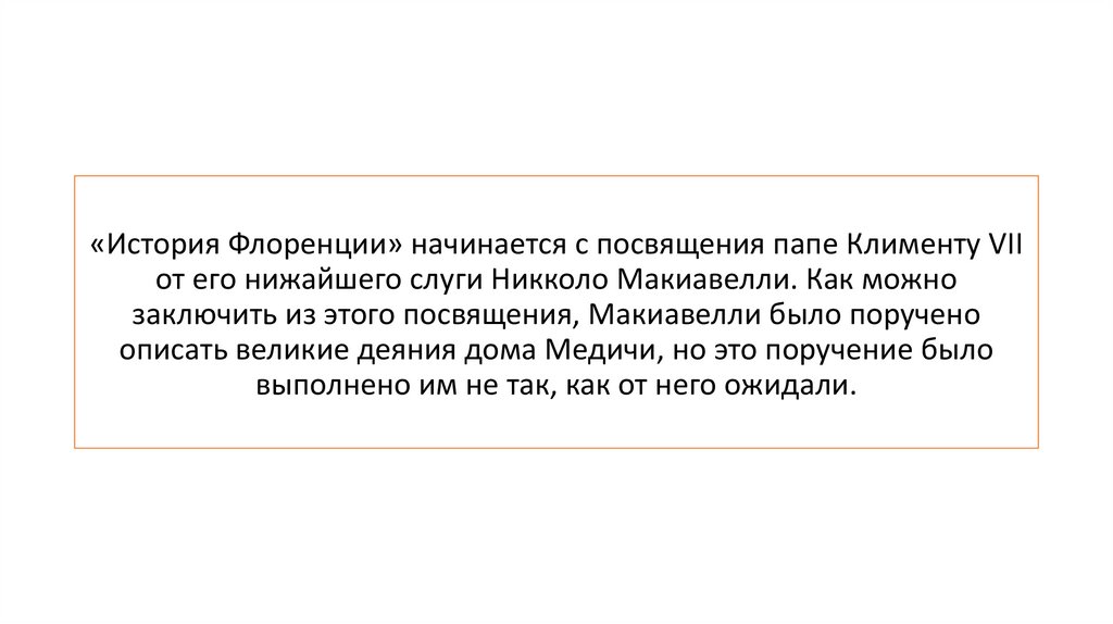 «История Флоренции» начинается с посвящения папе Клименту VIIот его нижайшего слуги Никколо Макиавелли. Как можно