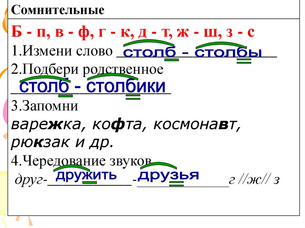 СомнительныеБ - п, в - ф, г - к, д - т, ж - ш, з - с