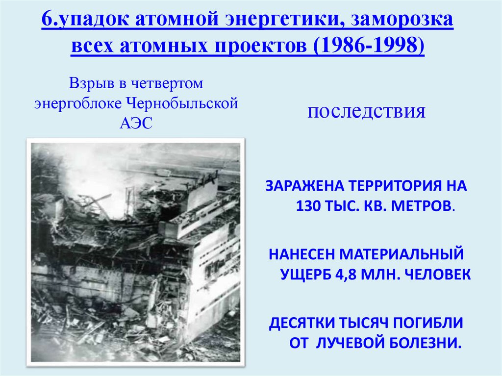 6.упадок атомной энергетики, заморозкавсех атомных проектов (1986-1998)