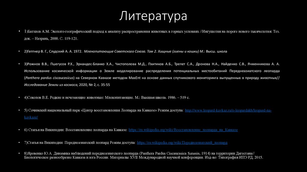 Литература• 1)Батхиев A.M. Эколого-географический подход к анализу распространения животных в горных условиях //Ингушетия на пороге нового тысячелетия: Тез.