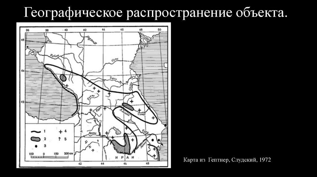 Географическое распространение объекта.Карта из Гептнер, Слудский, 1972