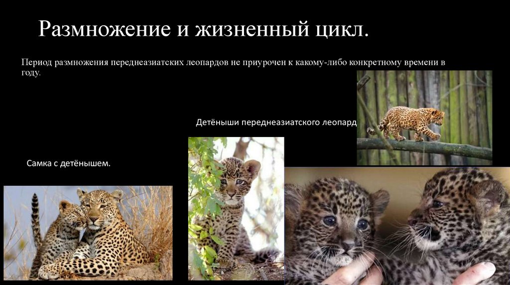 Размножение и жизненный цикл.• Период размножения переднеазиатских леопардов не приурочен к какому-либо конкретному времени в