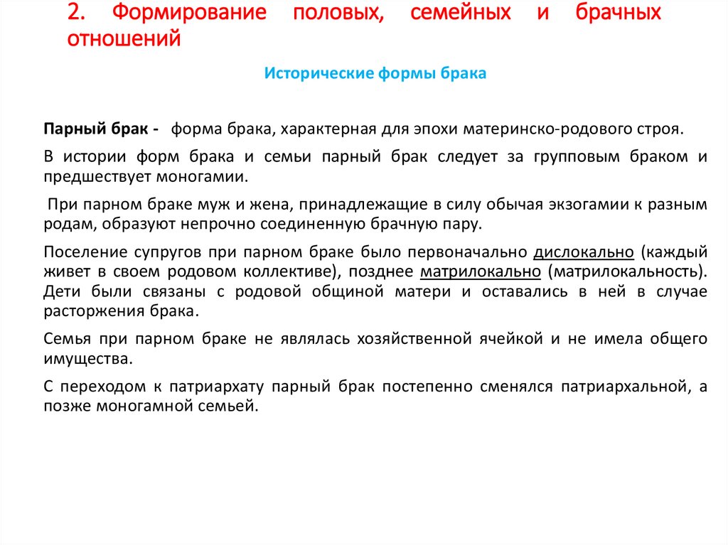 2. Формирование половых, семейных и брачных отношений.