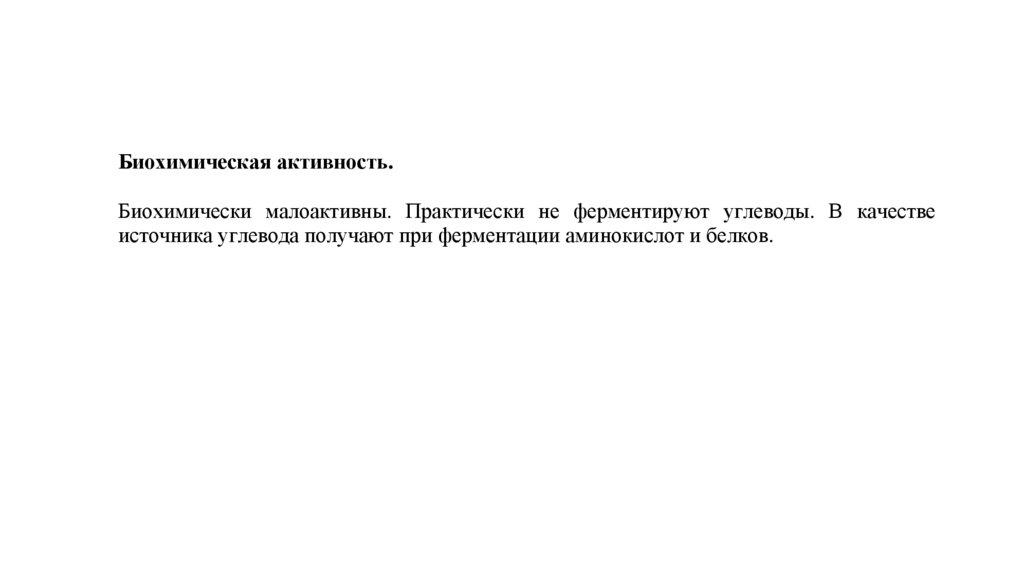 Биохимическая активность.Биохимически малоактивны. Практически не ферментируют углеводы. В качестве