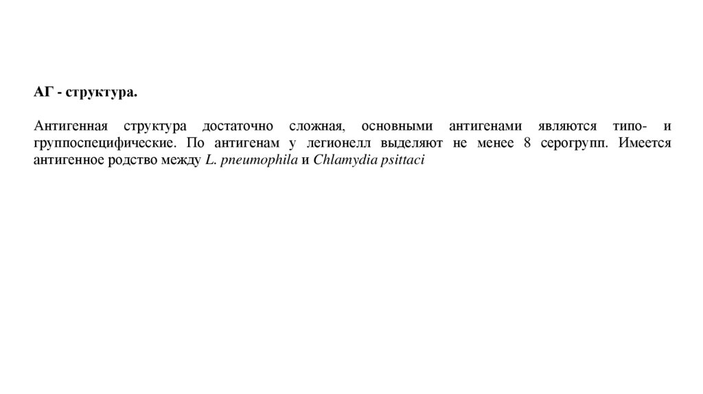 группоспецифические. По антигенам у легионелл выделяют не менее 8 серогрупп. Имеется