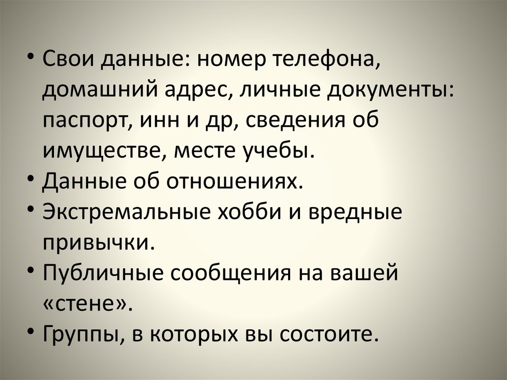• Свои данные: номер телефона,домашний адрес, личные документы: