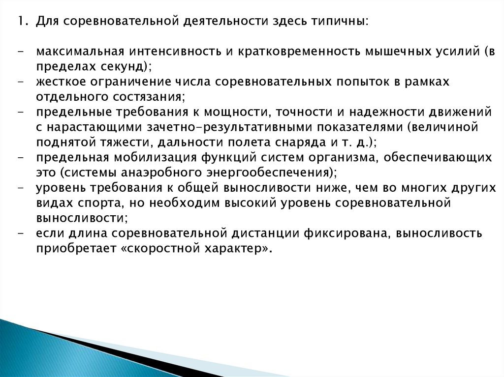 1. Для соревновательной деятельности здесь типичны:- максимальная интенсивность и кратковременность мышечных усилий (в