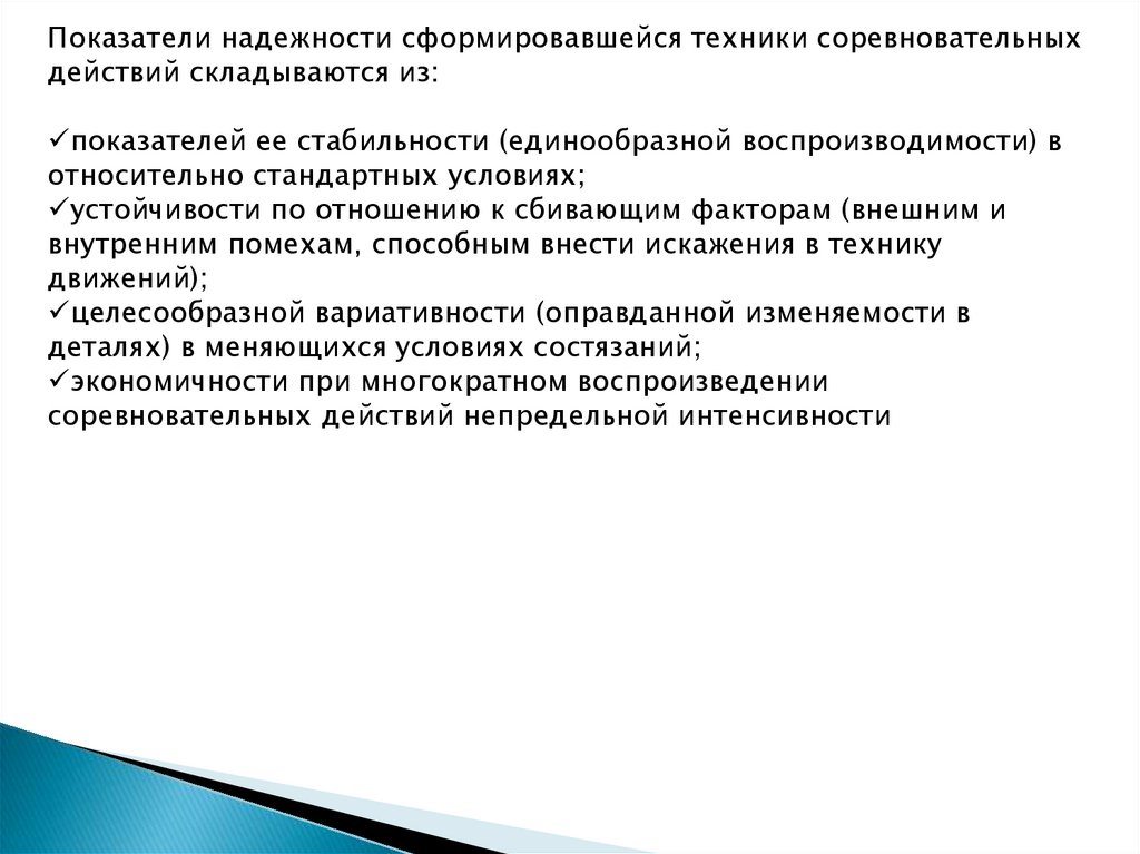Показатели надежности сформировавшейся техники соревновательныхдействий складываются из: