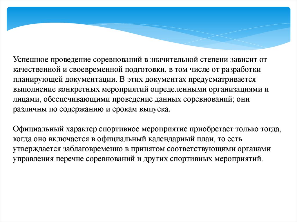 Успешное проведение соревнований в значительной степени зависит откачественной и своевременной подготовки, в том числе от разработки