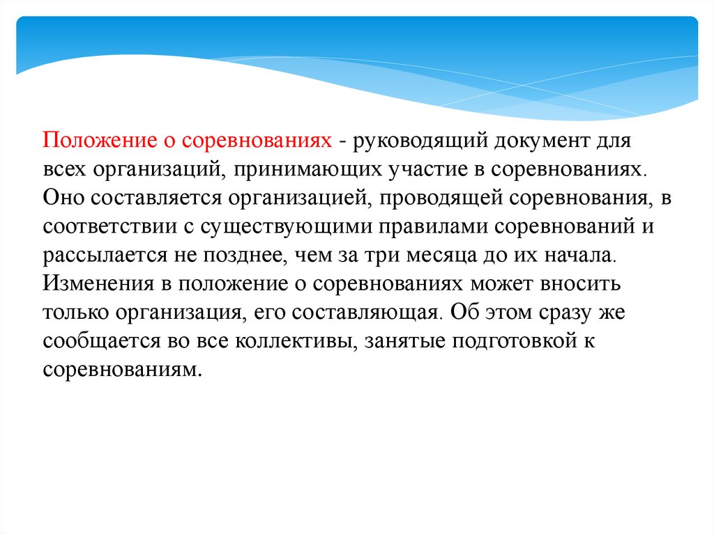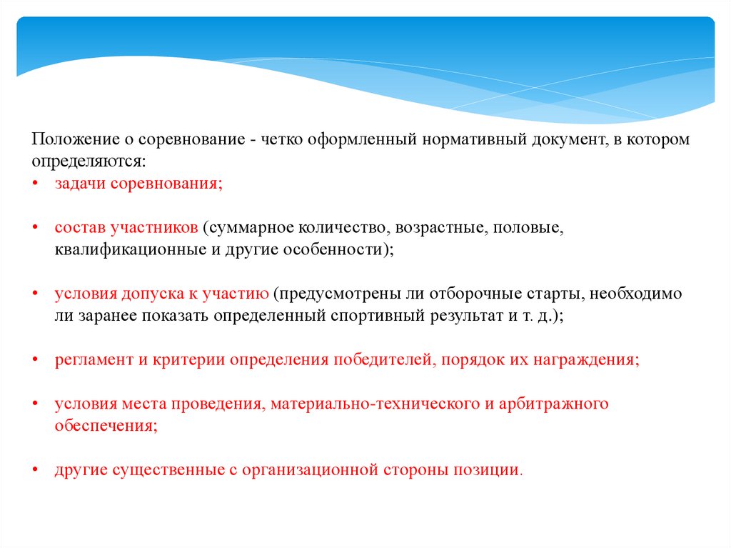 Положение о соревнование - четко оформленный нормативный документ, в которомопределяются: