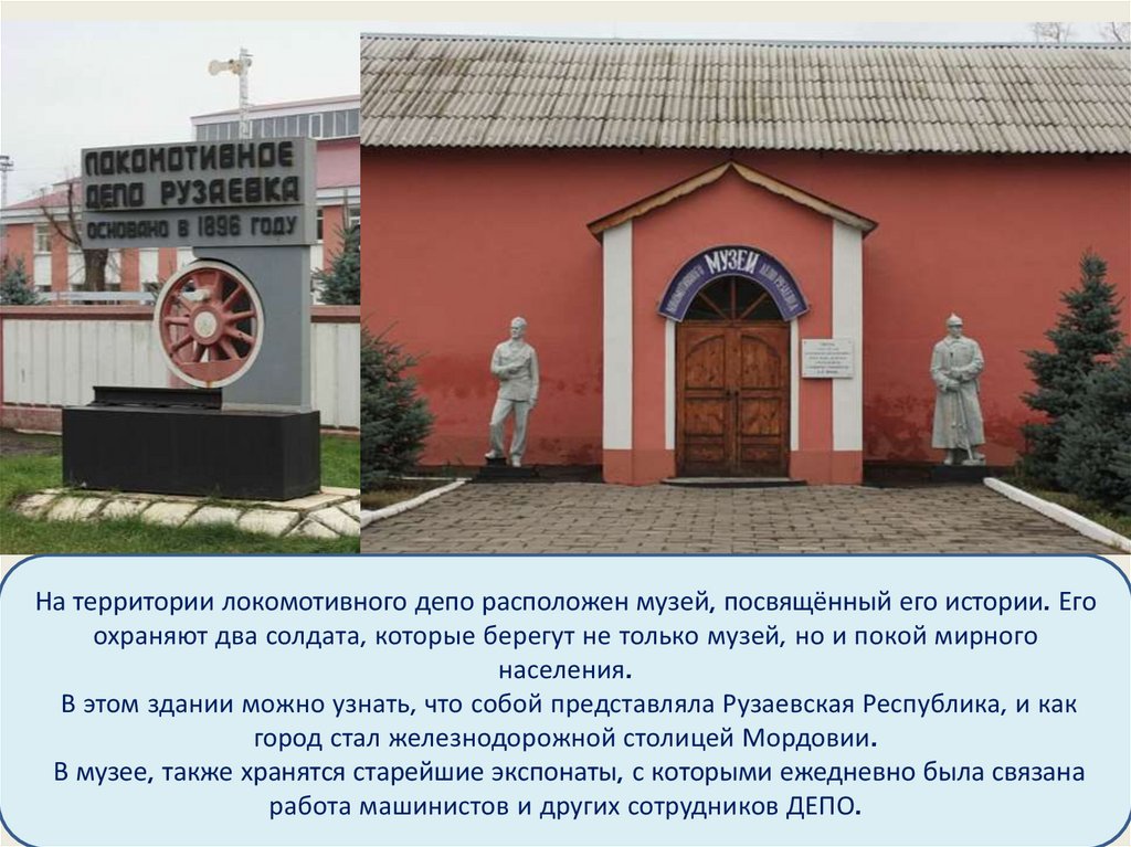 На территории локомотивного депо расположен музей, посвящённый его истории. Егоохраняют два солдата, которые берегут не только музей, но и покой мирного