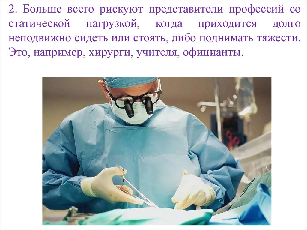 2. Больше всего рискуют представители профессий состатической нагрузкой, когда приходится долго