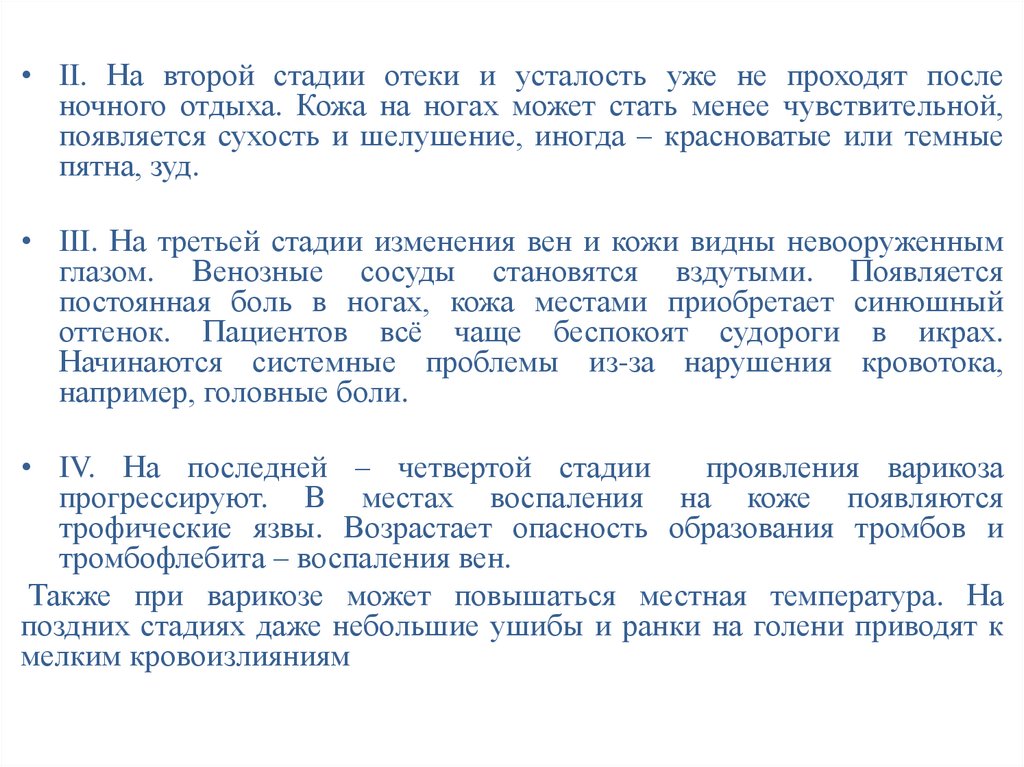 • II. На второй стадии отеки и усталость уже не проходят посленочного отдыха. Кожа на ногах может стать менее чувствительной,