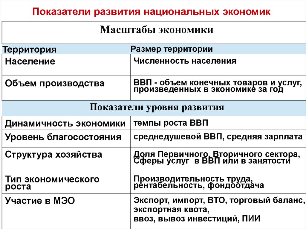 Показатели развития национальных экономикМасштабы экономики