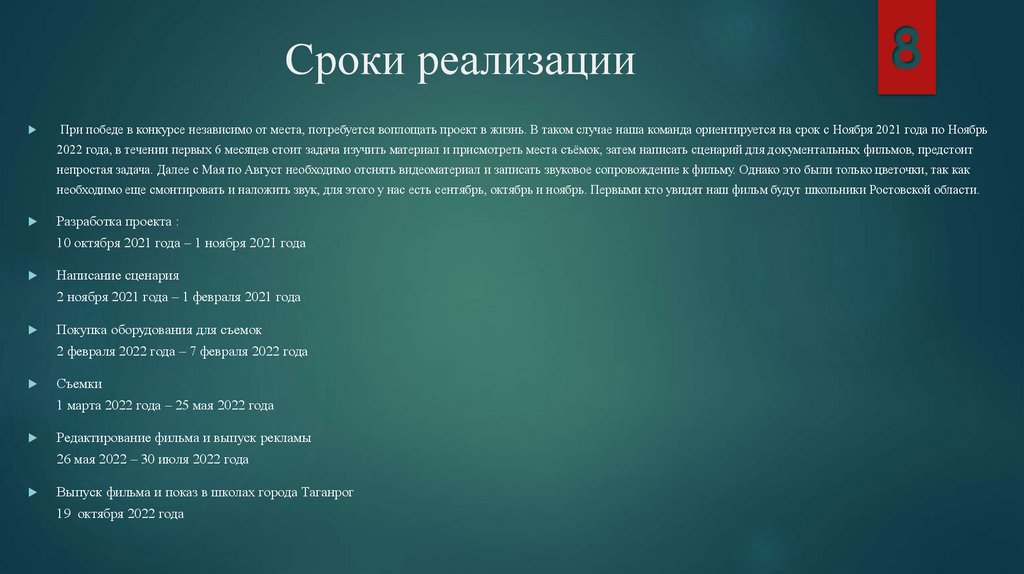 При победе в конкурсе независимо от места, потребуется воплощать проект в жизнь. В таком случае наша команда ориентируется на срок с Ноября 2021 года по Ноябрь