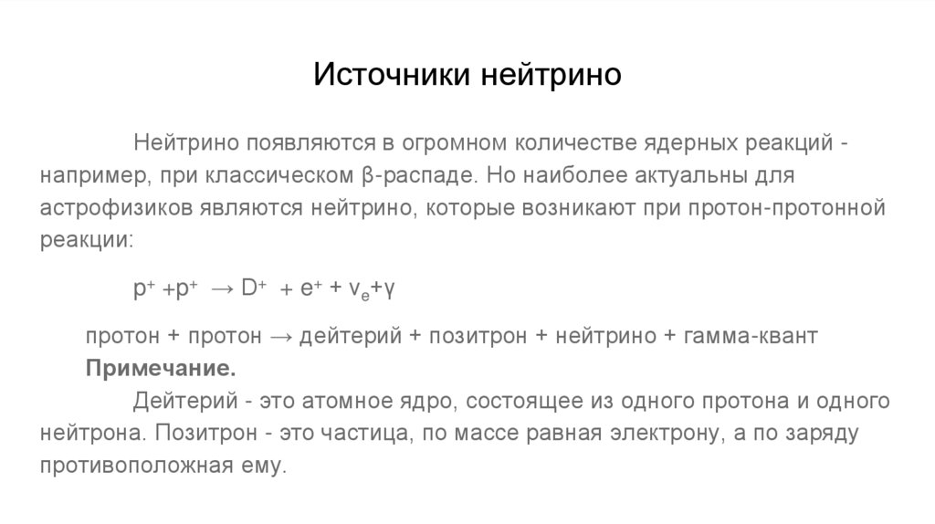 Источники нейтриноНейтрино появляются в огромном количестве ядерных реакций например, при классическом β-распаде. Но наиболее актуальны для