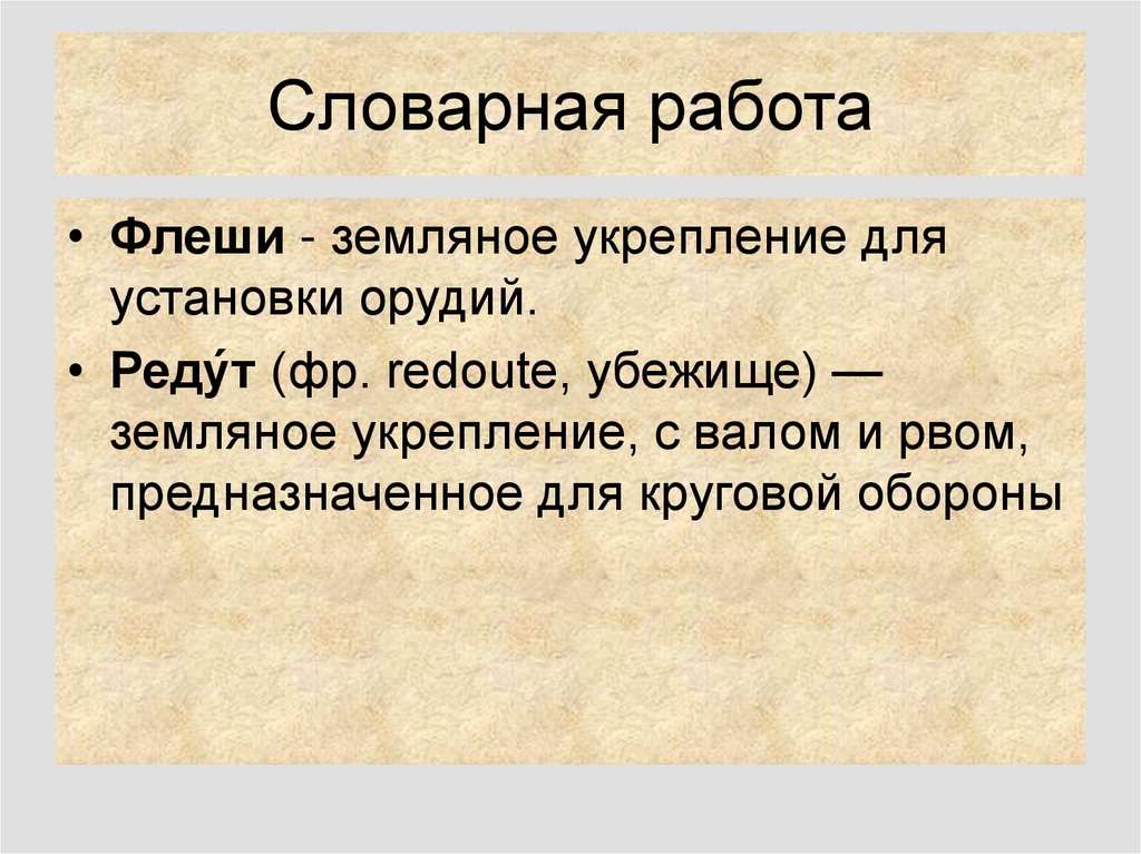 Словарная работа• Флеши - земляное укрепление для