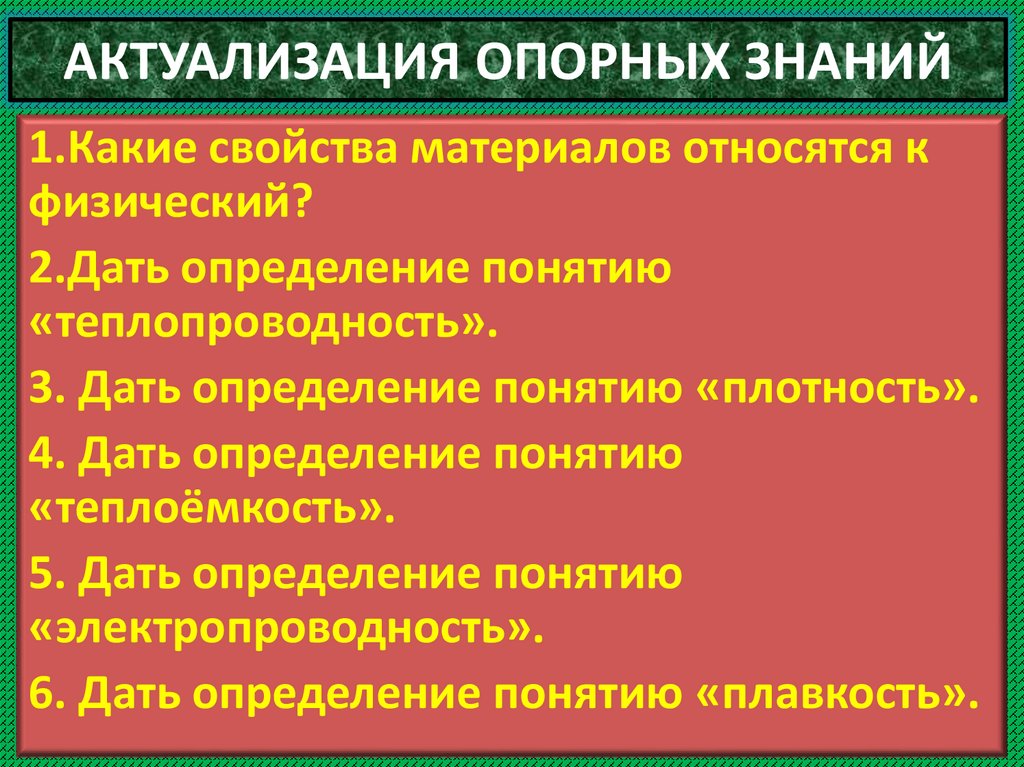 АКТУАЛИЗАЦИЯ ОПОРНЫХ ЗНАНИЙ1.Какие свойства материалов относятся к