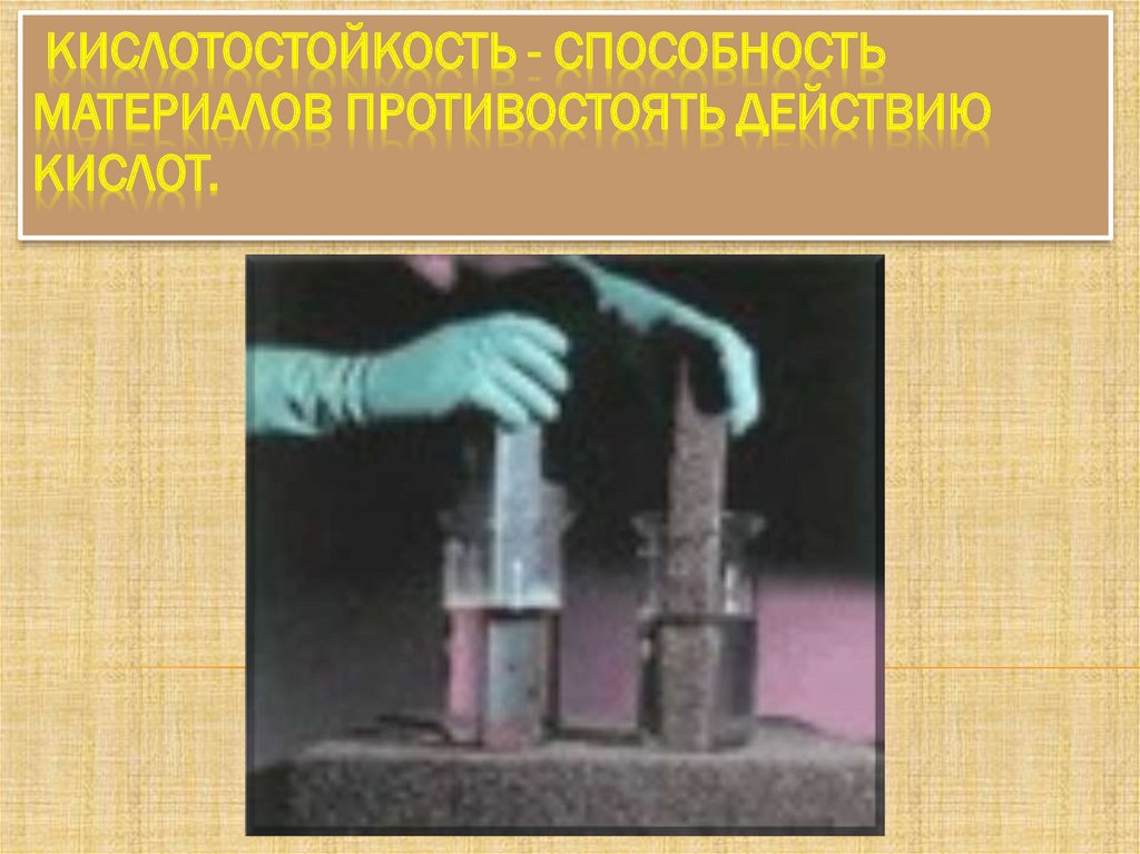 КИСЛОТОСТОЙКОСТЬ - СПОСОБНОСТЬМАТЕРИАЛОВ ПРОТИВОСТОЯТЬ ДЕЙСТВИЮ