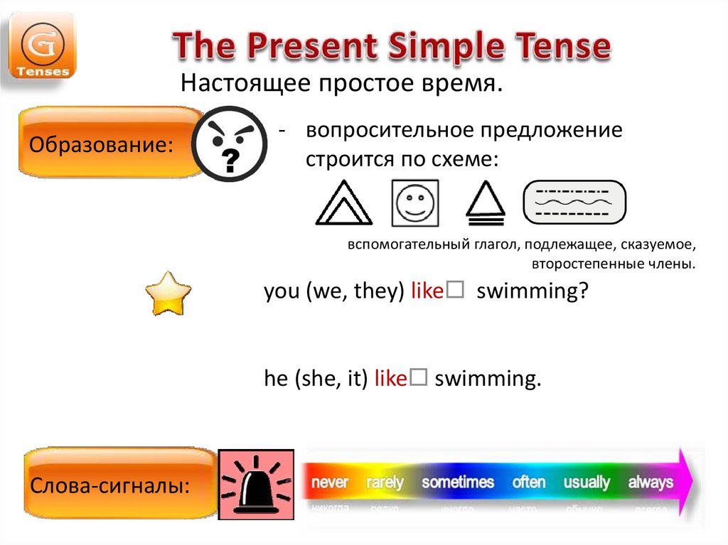 Подлежащее, вспомогательный глагол в отр. форме, сказуемое,