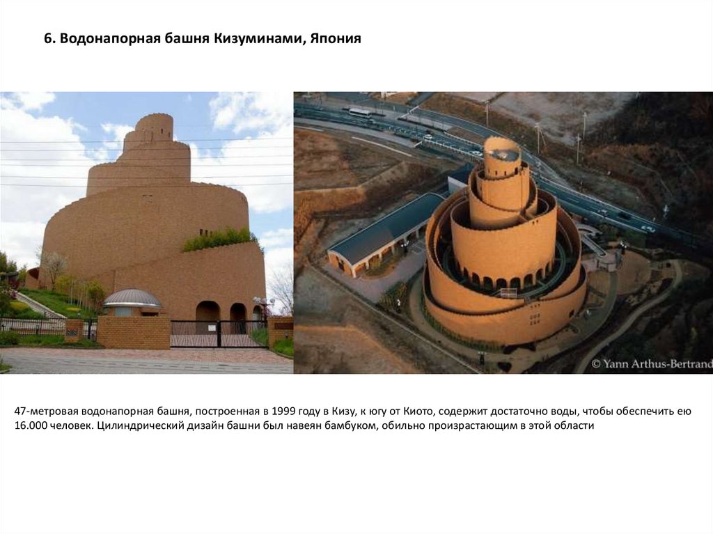 6. Водонапорная башня Кизуминами, Япония47-метровая водонапорная башня, построенная в 1999 году в Кизу, к югу от Киото, содержит достаточно воды, чтобы обеспечить ею