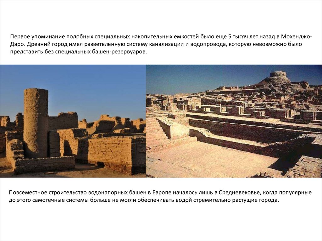 Первое упоминание подобных специальных накопительных емкостей было еще 5 тысяч лет назад в МохенджоДаро. Древний город имел разветвленную систему канализации и водопровода, которую невозможно былопредставить без специальных башен-резервуаров.