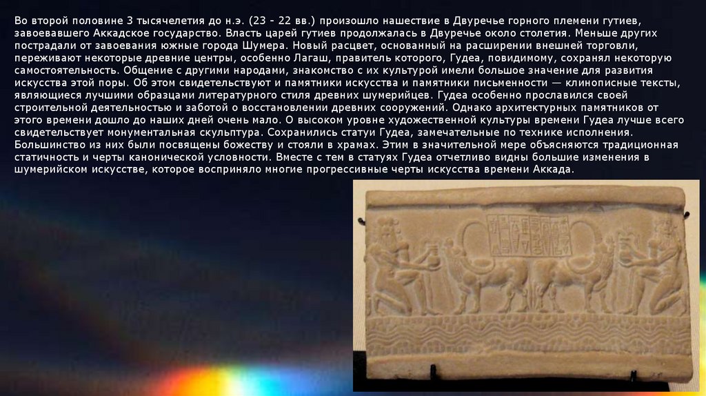 этого времени дошло до наших дней очень мало. О высоком уровне художественной культуры времени Гудеа лучше всего