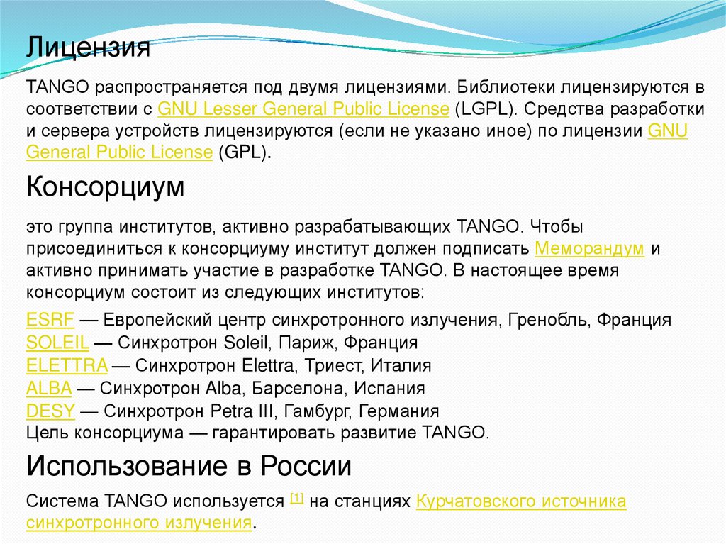 ЛицензияTANGO распространяется под двумя лицензиями. Библиотеки лицензируются в