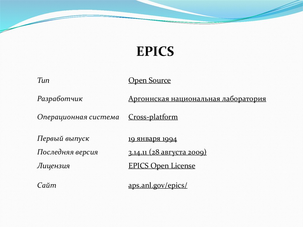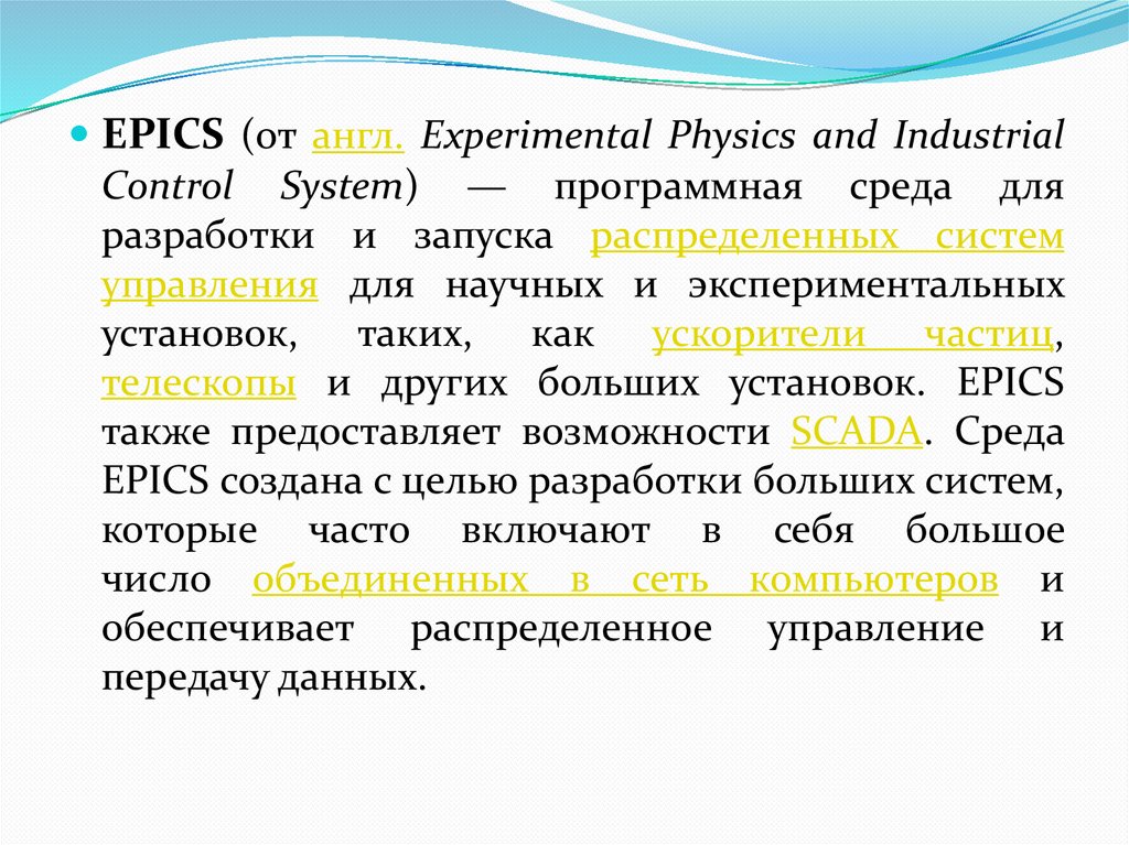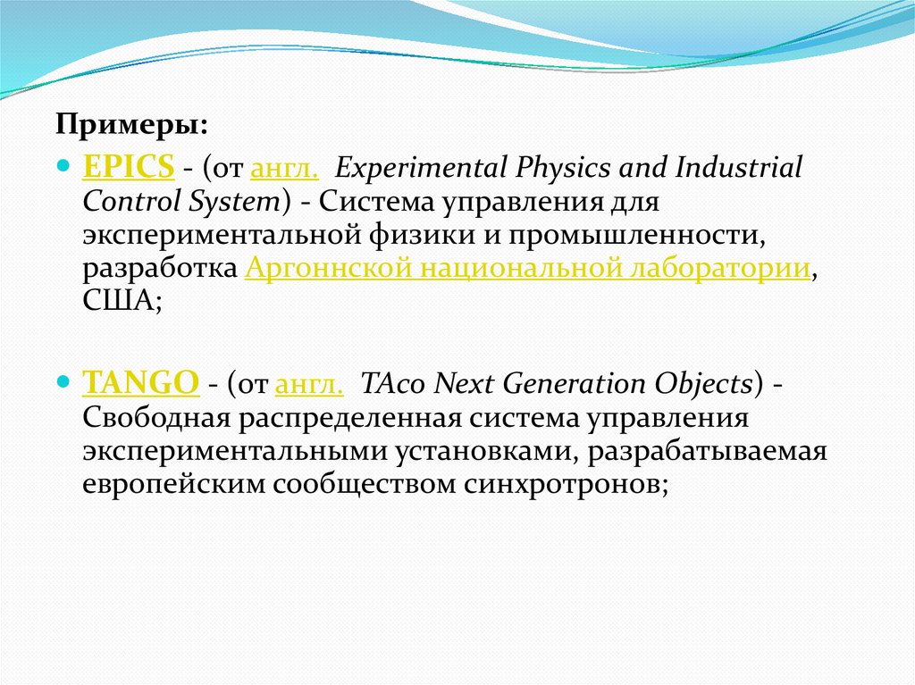 Примеры:EPICS - (от англ. Experimental Physics and Industrial