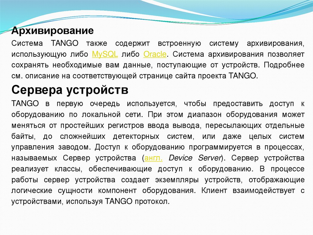 АрхивированиеСистема TANGO также содержит встроенную систему архивирования,
