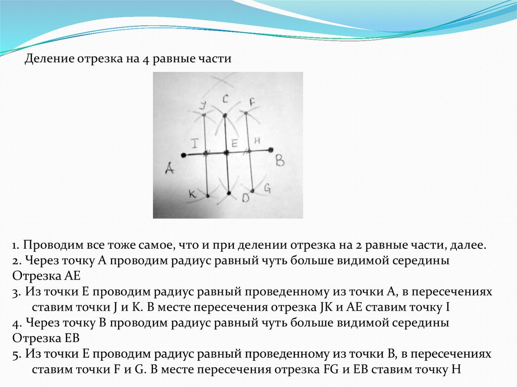 Деление отрезка на 4 равные части1. Проводим все тоже самое, что и при делении отрезка на 2 равные части, далее.