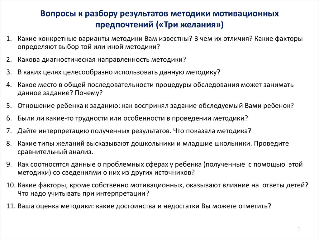 Вопросы к разбору результатов методики мотивационных предпочтений («Три желания»)