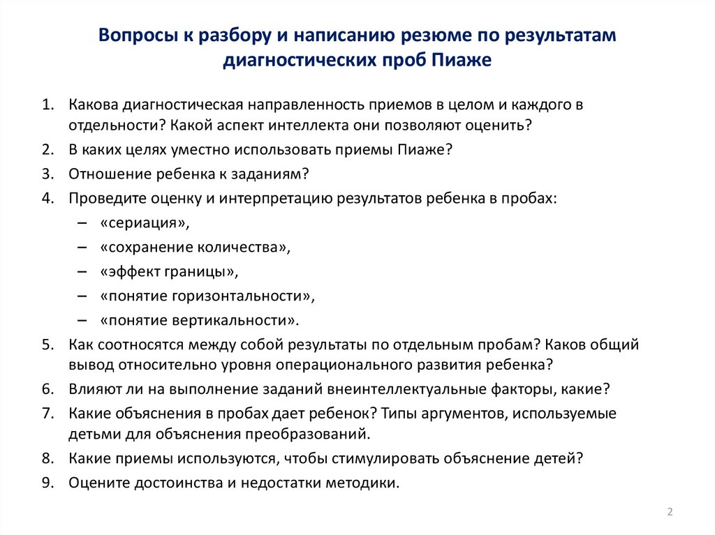 Вопросы к разбору и написанию резюме по результатамдиагностических проб Пиаже