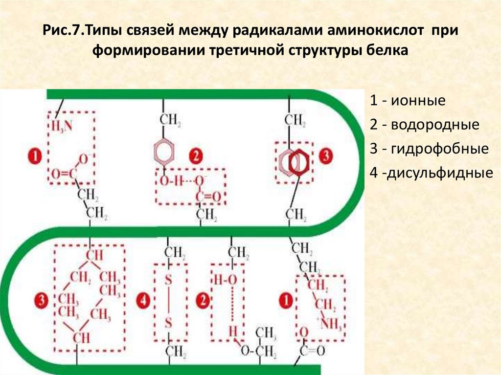 Рис.7.Типы связей между радикалами аминокислот приформировании третичной структуры белка