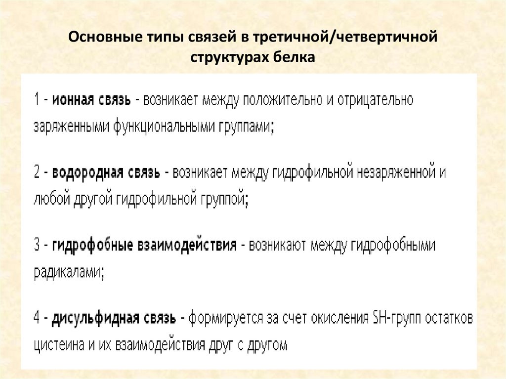 Основные типы связей в третичной/четвертичнойструктурах белка