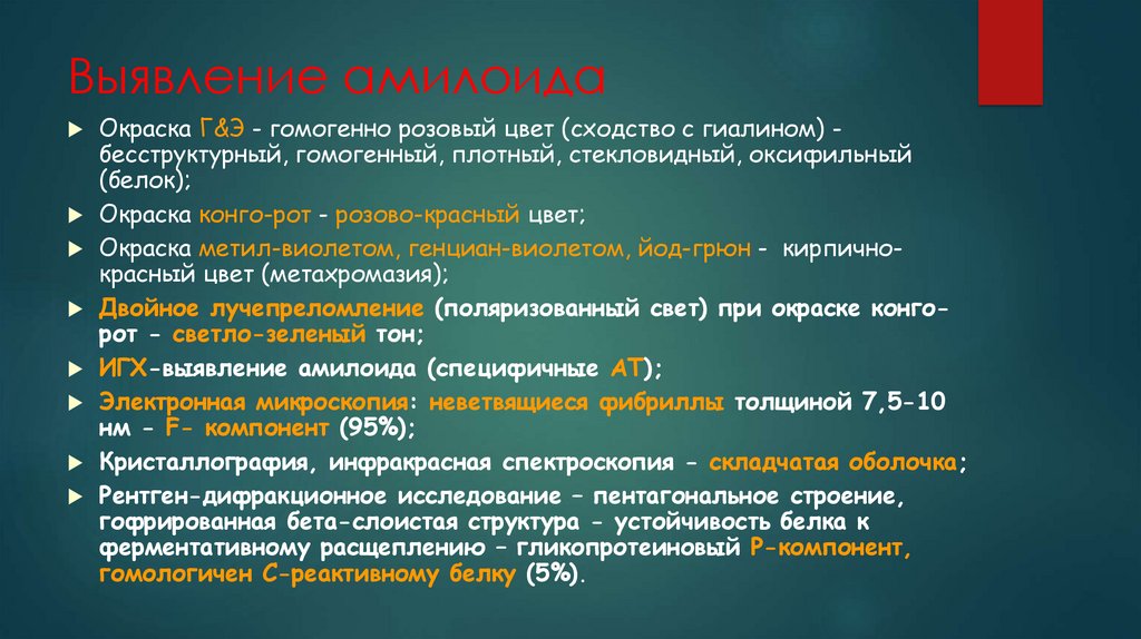 Выявление амилоидаОкраска Г&Э - гомогенно розовый цвет (сходство с гиалином) бесструктурный, гомогенный, плотный, стекловидный, оксифильный