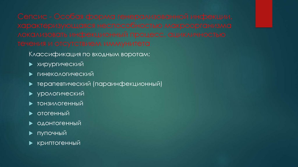 Сепсис - Особая форма генерализованной инфекции,характеризующаяся неспособностью макроорганизма